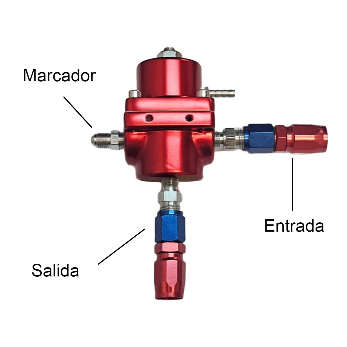 Descripción: Unidad mecanizada en aluminio de alta calidad, reguladora de presión de combustible para ser utilizado en sistema con carburador. Regulación por diafragma de 2 a 6 psi (Libras). En este caso se entrega con las conexiones aluminizadas T/Aeroquip, para su utilización con el flexible mallado de combustible de interior 8mm (FNY 0208 / AN6). Cuenta con una salida para marcador y una entrada de vacío NO UTILIZADA EN COMPETICION.